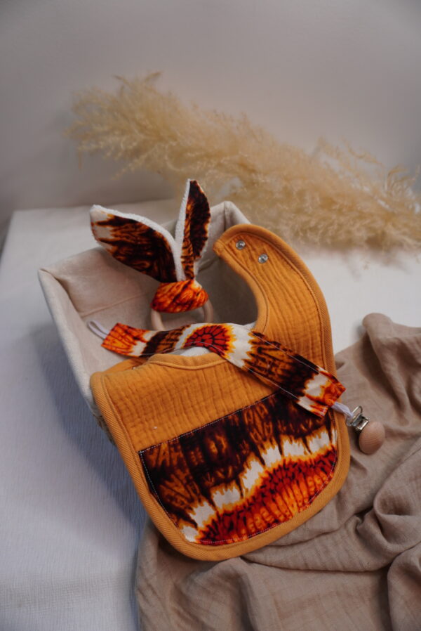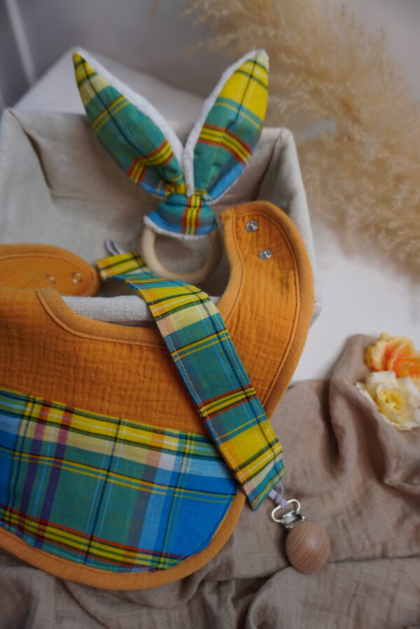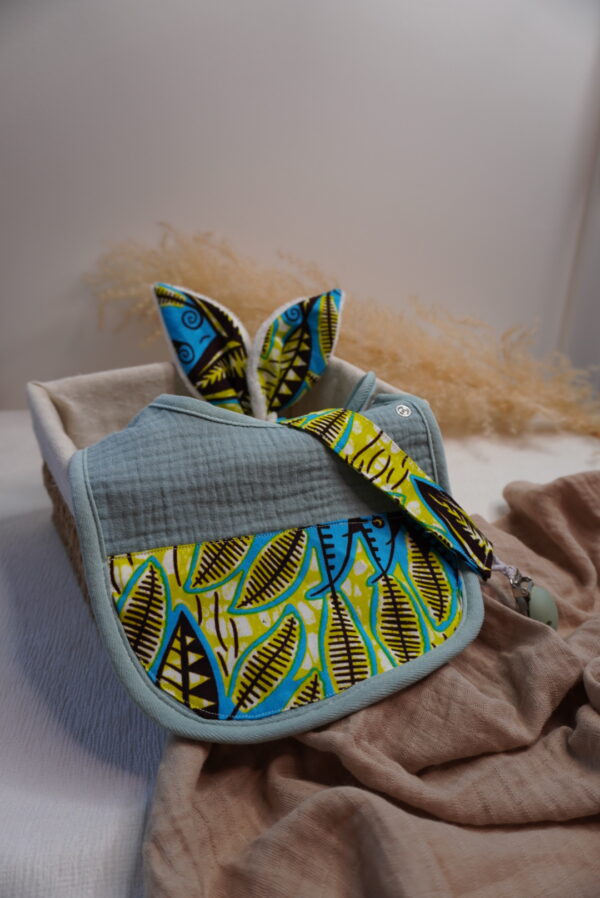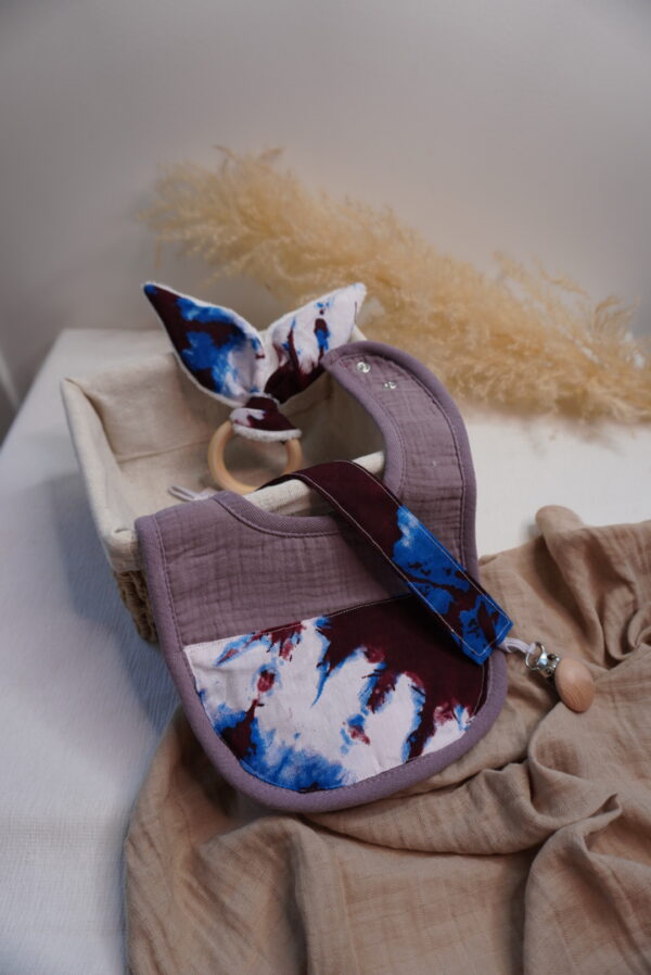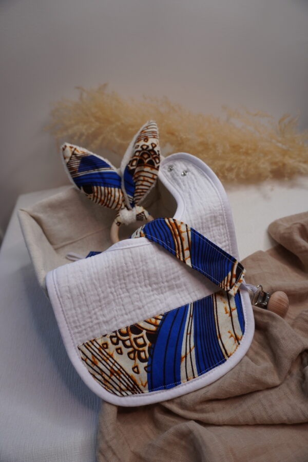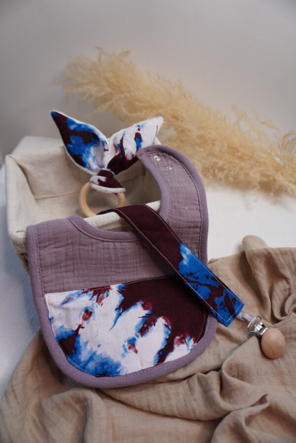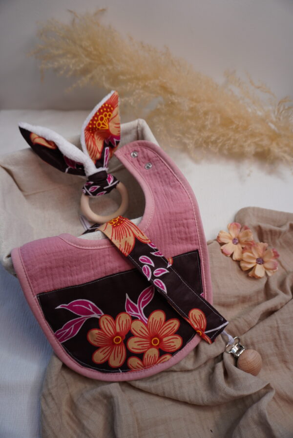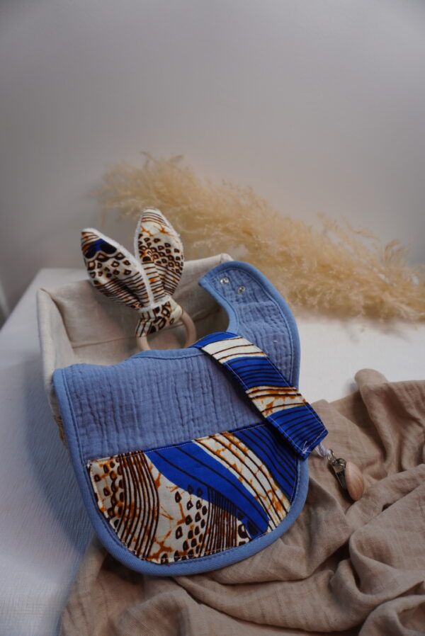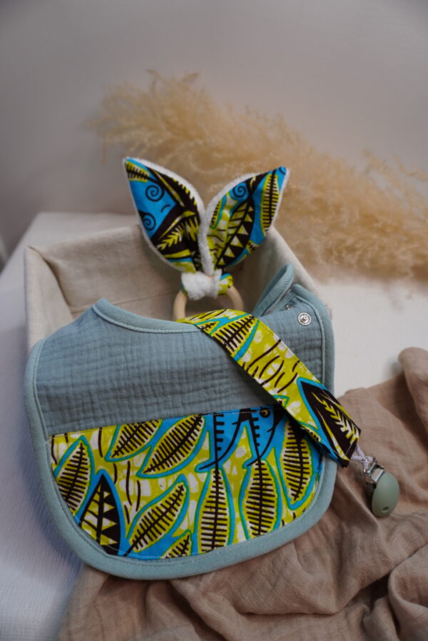 Box bébé M Syka Couture : l’essentiel bébé fait main avec un bavoir, un attache tétine et un jouet de dentition assorti. Pratique et doux l’indispensable bébé.